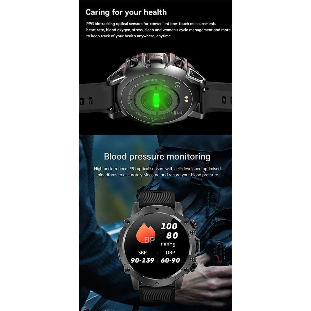 Die Premium-Smartwatch AK56 vereint Luxus und Leistung in einem beeindruckenden Paket. Mit einem beeindruckenden 1,43-Zoll-IPS-LCD-Touchscreen und 100 verschiedenen Zifferblättern für individuelle Anpassung. Sie verfügt über einen Musik-Player für absoluten Hörgenuss und einen künstlichen Intelligenz-Herzfrequenzmesser für die genaue Überwachung Ihrer Herzgesundheit. Der 400-mAh-Akku bietet eine Autonomie von 10 Tagen und die IP68-Zertifizierung garantiert Robustheit. Mit zahlreichen Funktionen wie Herzfrequenz- und Schrittzähler, vollständiger Überwachung der Schlafqualität und Widerstandsfähigkeit gegenüber den täglichen Herausforderungen ist es die perfekte Wahl für Ihr digitales Leben.