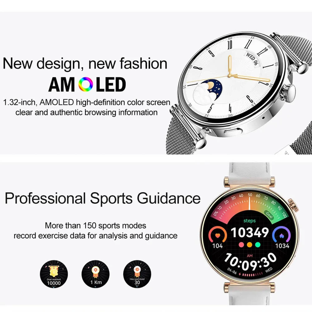 Die Damen-Smartwatch MK41 ist ein äußerst funktionales Accessoire, das Hightech mit elegantem Design verbindet. Sie verfügt über einen 1,32-Zoll-Amoled-Touchscreen mit einer Auflösung von 460 x 460 Pixeln und ein griechisches Menü für eine komfortable Bedienung. Mit 100 Zifferblättern, die Sie an Ihren Stil anpassen können. Sie bietet vollständige Kontrolle über die Schlafqualität, misst Herzfrequenz, Blutdruck und Blutsauerstoffgehalt und verfügt über einen Schrittzähler und einen Kalorienverbrauchsmesser. Darüber hinaus bietet es eine Anrufannahmefunktion über Bluetooth, Smartphone-Kamerasteuerung und eine Akkulaufzeit von bis zu 10 Tagen. Die IP68-Zertifizierung macht es wasserdicht.