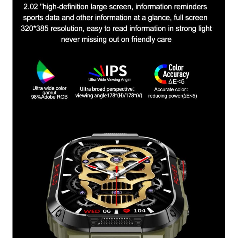 Verbessern Sie Ihren Alltag mit der Smartwatch TK25! Sie verfügt über ein klares 2,02-Zoll-IPS-LCD-Touchscreen-Display (380 x 380), 100 Zifferblätter und eine vollständige Überwachung der Schlafqualität. Mit einem 300-mAh-Akku für 10 Tage Standby-Zeit, Bluetooth V5 zum Annehmen von Anrufen und fortschrittlicher Anti-Kratz-Technologie. Herzfrequenz-, Blutdruck- und Blutsauerstoffmesser sowie Kamera- und Musikplayer-Steuerung. Kompatibel mit iOS und Android, IP68-zertifiziert.